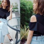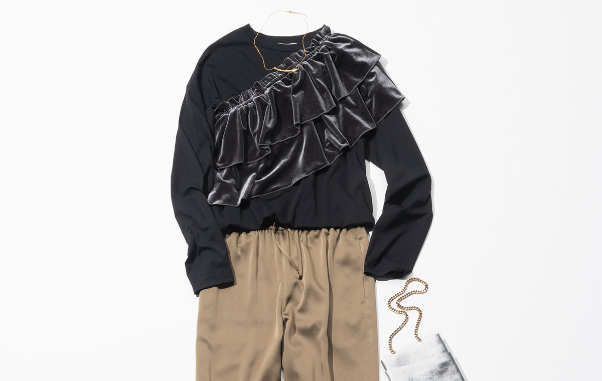 秋に向けてぜひ買い足したいビスチェ付きトップス。シンプルコーデがベロアのフリルビスチェひとつで様変わりして、簡単に華やかさを加算できる。ビスチェはこのコーデのように斜めがけしたり、ベーシックに重ねたり、着こなし次第で印象も変化。ワイドパンツの落ち感素材、ブラック×ブラウンの配色も大人っぽさを好アシスト。