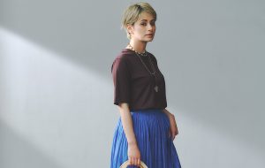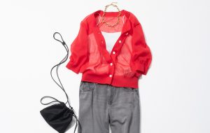 トップス¥7,920(アバハウスインターナショナル オンラインストア〈アバハウス マヴィ〉) パンツ¥8,990(PLST) ネックレス¥20,900(フラッパーズ〈メラキ〉) バッグ¥26,400(ノーベルバ〈ノマディス〉) 靴¥29,150(グラビテート〈カミナンド〉)