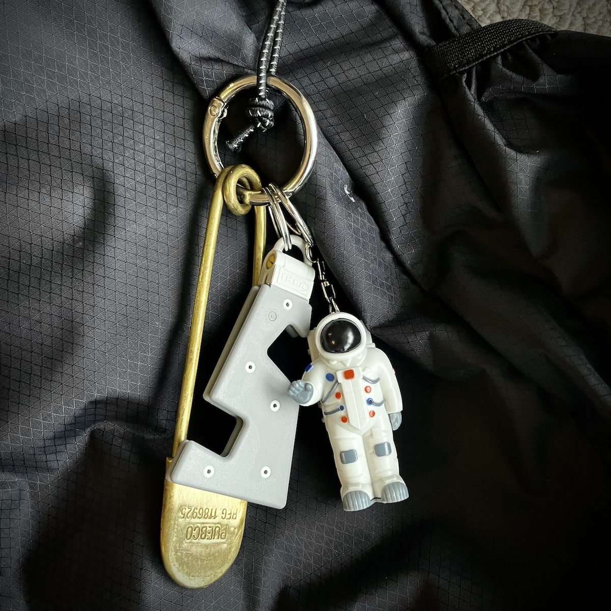 じゃらじゃらしたバッグチャームが流行っていますが、私も自分なりにアレンジしてみました!キッカーランドの宇宙飛行士のキーホルダー、イケアのスマホスタンド、プエブコのビッグピンを、100均で手に入れたカラビナでまとめて。全体のテンションをなんとなーく揃え、シルバーとゴールドもミックスさせて、汎用性を高くしたのがポイントです!