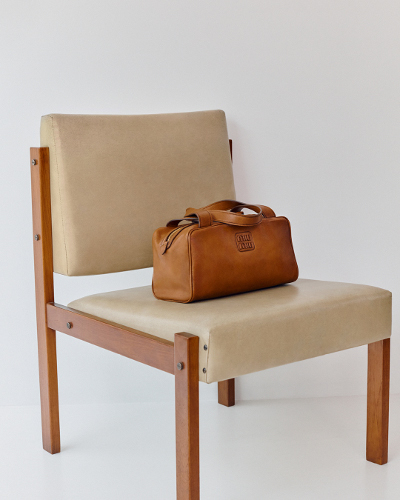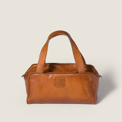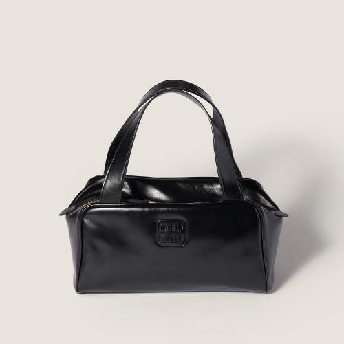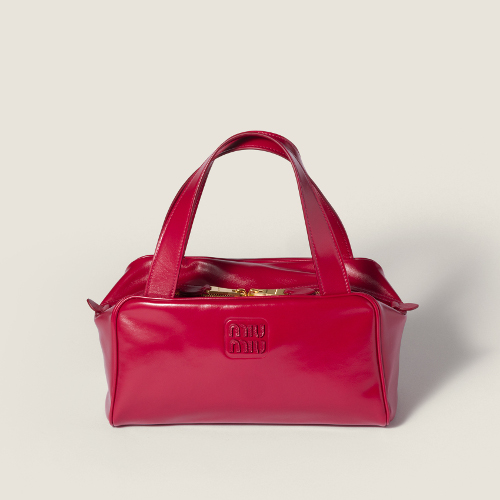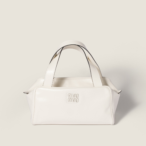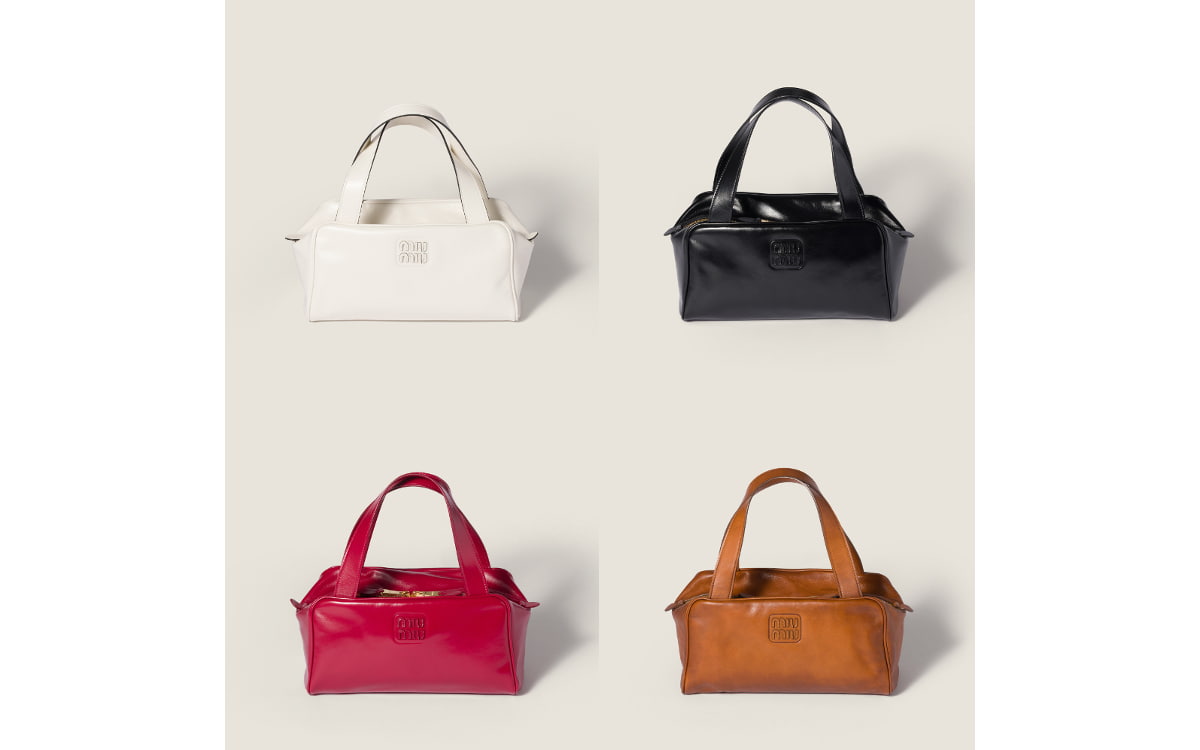 タイムレスなボストンタイプのバッグを、持ちやすいフラットなハンドル、レザーのレタリングロゴなどミュウミュウらしいディテールで仕上げた新作。