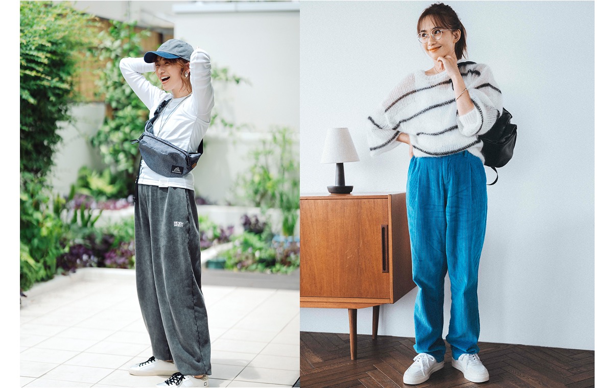カットソーとスウェットパンツの簡単ワンツーながら、レイヤード風デザインのトップスや、ベロアっぽい光沢のスウェットで、洒落感たっぷりなこなれカジュアルを演出。