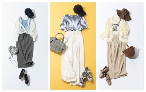 体型カバー可能なトップスに同系色の柄スカートを合わせ、涼しげに。裾の揺れ感がフェミニンで柔らかな質感のスカートも、ネイビーカーラーならクール。シルバーバッグでキレを足し、スニーカーで中和して程よいカジュアルコーデに。
