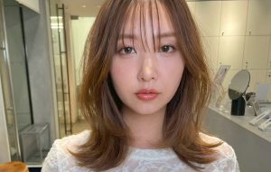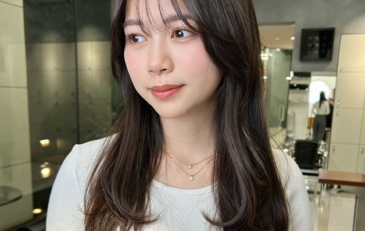 シースルーバングで涼しさを演出し、レイヤーで顔まわりに動きをつけた今っぽいロングレイヤースタイル。シースルーバングは軽やかで涼しげな印象を与え、前髪の隙間から覗くおでこが表情を明るく見せてくれますから、暑い季節には重く見えがちな大人のロングヘアにも好相性な前髪スタイルです。