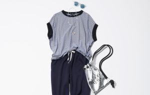 ブルゾン¥15,950・靴¥17,160(NIKE カスタマーサービス〈ナイキ スポーツウェア〉) カットソー¥4,990(オンワード樫山〈アンフィーロ〉) パンツ¥26,400(ティッカ) ネックレス¥18,700(ココシュニック〈ココシュニック オンキッチュ〉) バッグ¥23,100(ゴールドウイン カスタマーサービスセンター〈ザ・ノース・フェイス〉)