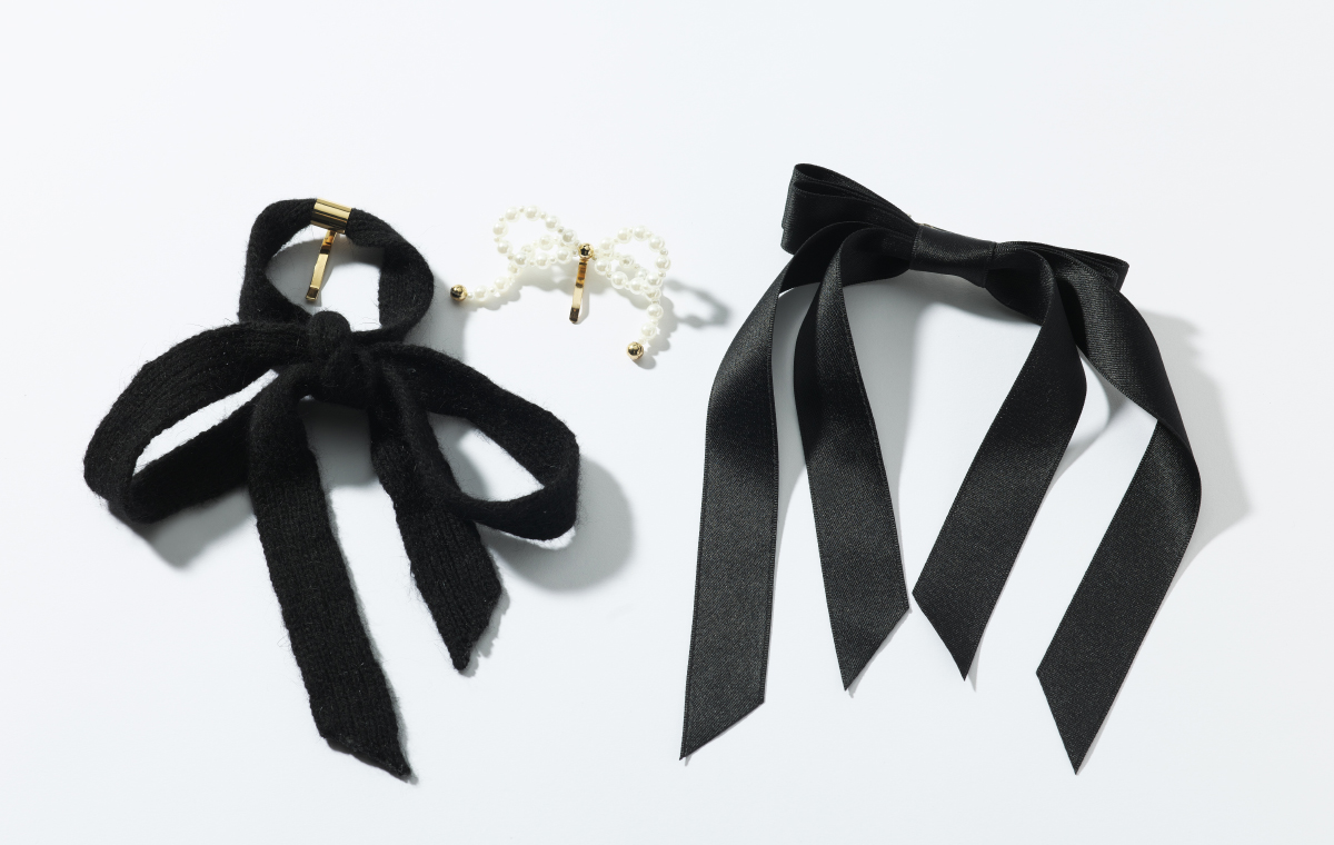 「ヘアカフはお団子やポニーテールなど、一つ結びのときのワンポイントに。リボンといえどラブリーすぎずシックな印象もある、長めのリボンを手に取ることが多いです。ハイブランドで買うこともあるし、カジュアルなアクセサリーショップや3COINSで購入することもあります。なんといってもアレンジに差すだけのワンステップで簡単だし、バランスも取りやすいのが魅力! 」(浅野さん)