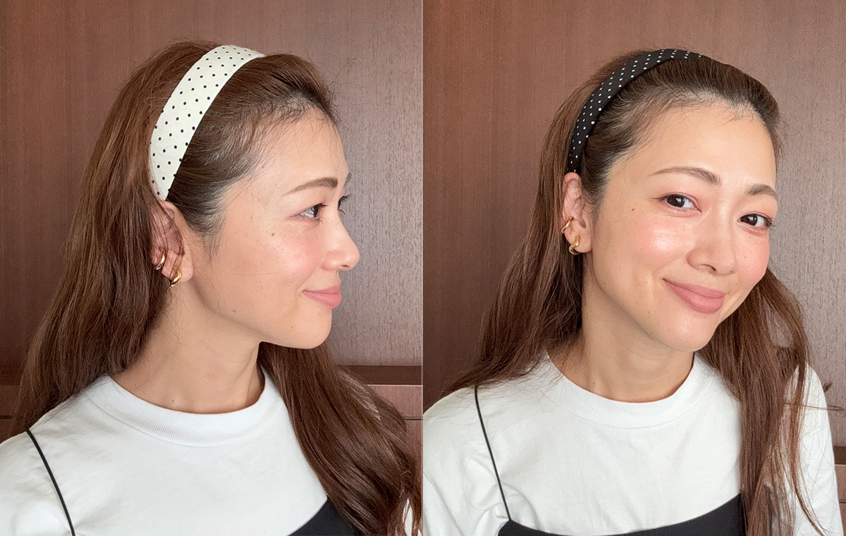 「ブラックコーデやパンツスタイルなどクールなファッションのとき、Tシャツコーデなどシンプルなファッションのときに、カチューシャで華やぎをオン。カチューシャは髪をおろしている日につけることが多いです。『VENTO』のドット柄カチューシャはモノトーンなのでほどよく甘さがプラスされ、大人も使いやすいアイテム。ロングのダウンスタイルでもメリハリがついてお気に入りです」(浅野さん)