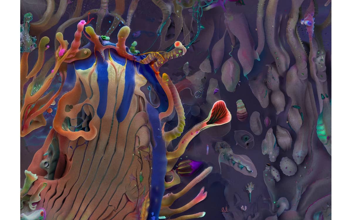 ソフィア クレスポは、人工知能(AI)と生命科学の融合において独自の詩学を築いたアーティスト。AIのメカニズムがどのように有機的な形態を模倣し、進化させることができるかを探求し、虫の翅(はね)や植物の胞子、深海のクラゲのような既視感を抱かせる形ながら、決して見たことのないものたちを生成しています。