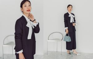 その後も活躍する、凛々しいノーカラー×テーパードパンツ