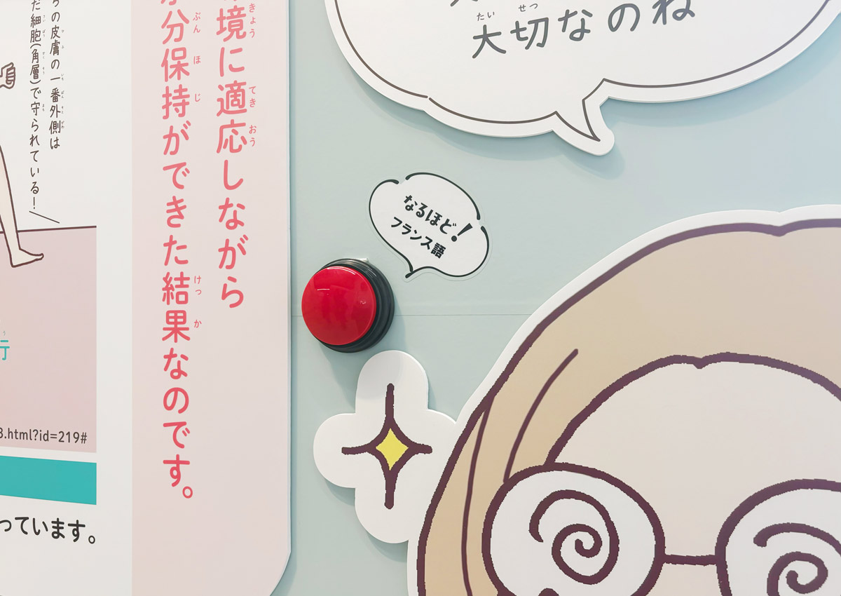 「肌を知って正しくケア」がテーマのエリア1では、難しい内容もかわいいイラストや図でわかりやすく解説。各所に設置された「なるほど!ボタン」を思わず何度も押してしまいました。