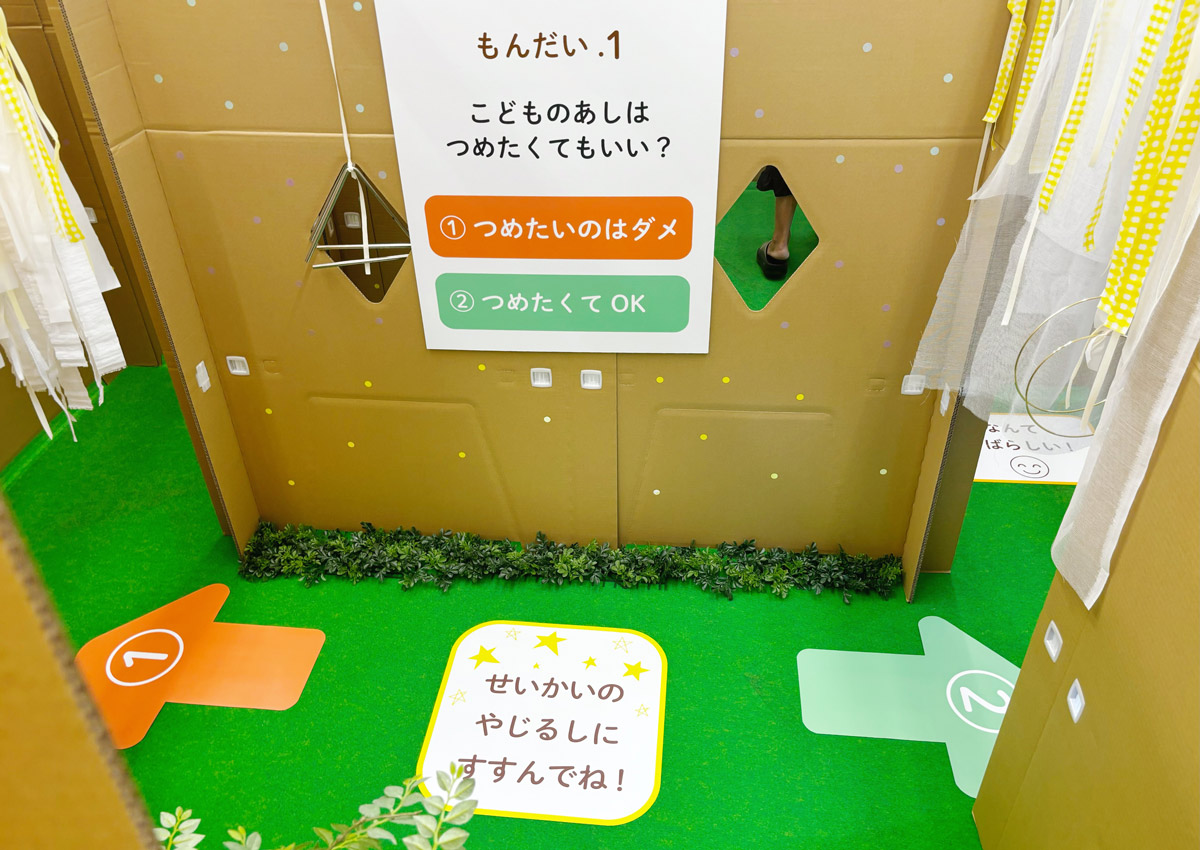 エリア2にあるスタッフさんの手作り段ボール迷路には、子どものスキンケアに関する7つのクイズが用意されています。答えを間違えると行き止まりに。