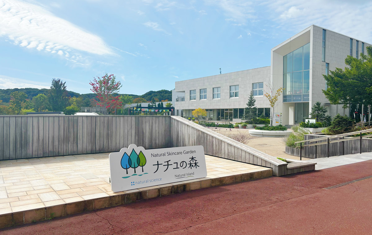 札幌や新千歳空港から車でおよそ1時間半。白老町・虎杖中学校の跡地に誕生した「ナチュの森」は、倶多楽湖(くったらこ)の清らかな水を活かした化粧品づくりを行う施設。その敷地内には工場だけでなく、倶多楽湖の湧水を使ったキッチンやエステサロン、子どもから大人まで楽しめる体験型のミュージアム、ガーデンやショップまで揃っています。