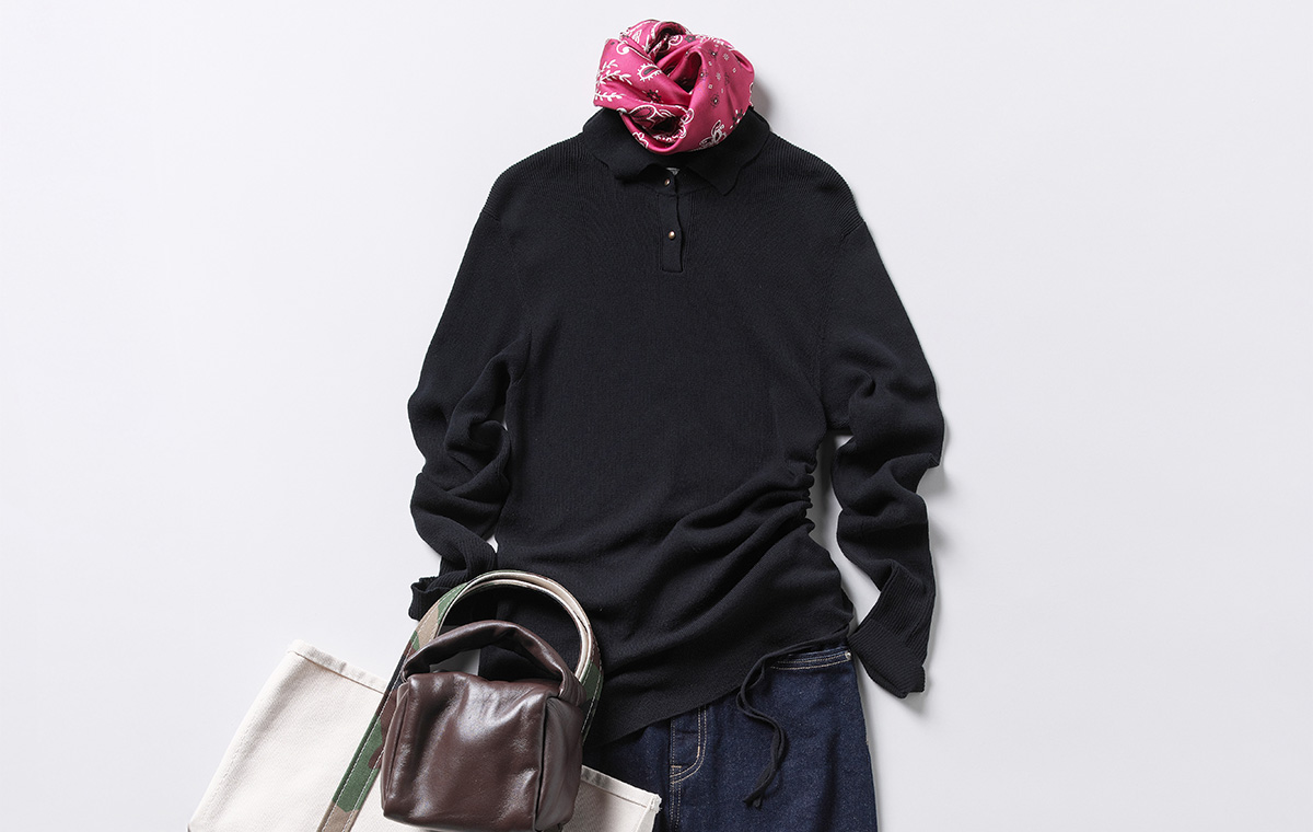 ストレートのインディゴデニムをきれいめに引き寄せるニットポロは、サイドのドローコードを絞るとシルエットが変わるアシンメトリーデザイン。濃色の上下に、アクセサリー代わりにバンダナ柄のスカーフをひと巻きし、顔まわりにポイントを! 黒では重見えしてしまうから、ブーツとバッグでチョコレートブラウンを散らして、品のいいカジュアルさを加味して。