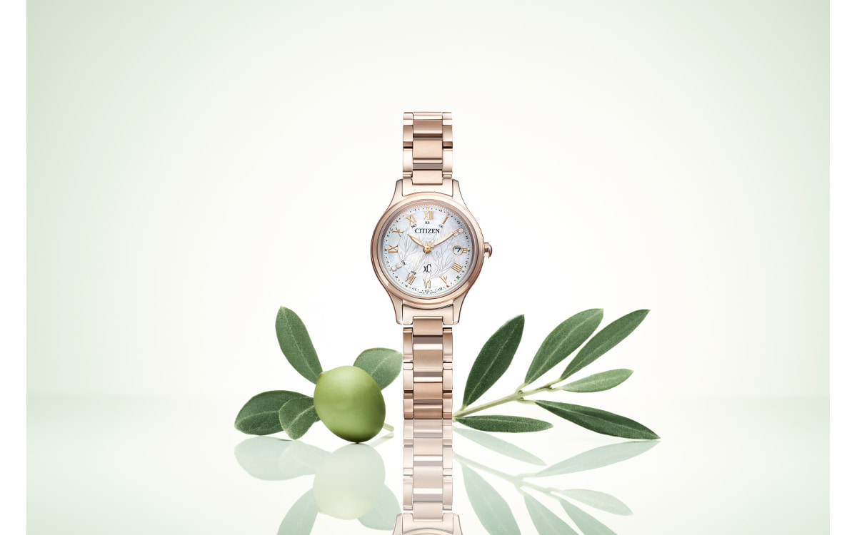白蝶貝の文字板の中央にオリーブの葉と実をエッチングパターンで描き、外側にはラメを散りばめきらめきをプラス。インデックスもオリーブの葉や実をイメージしたパーツをあしらったオリジナルデザインです。北川景子さんの誕生日8月22日にちなんで、8時と2時の位置に合計4ポイントのラボグロウン・ダイヤモンドをセッティング。22分の位置にはオリーブの花の形を描いています。