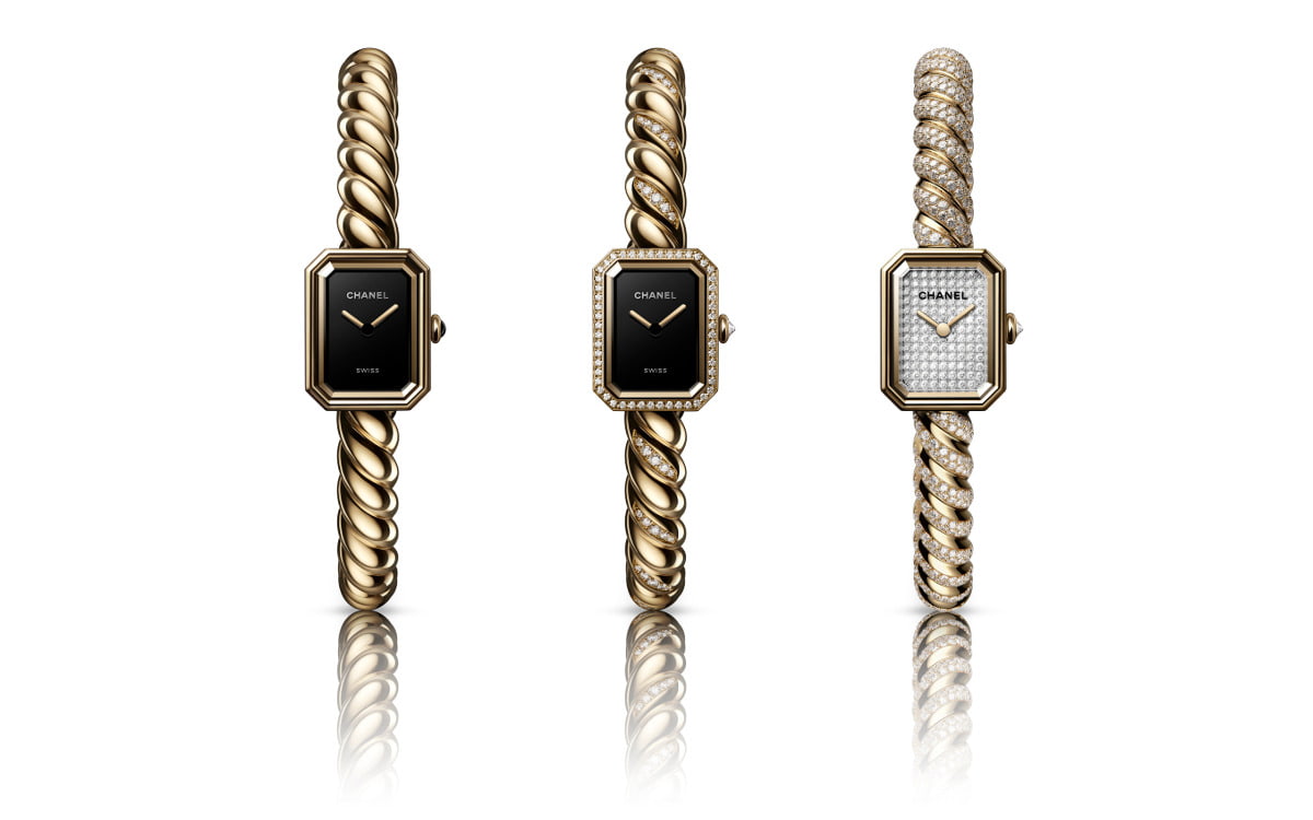 「プルミエール ガロン」は、シャネルのスーツを多彩な素材や技術で彩ってきたブレードのツイストを模した、18Kイエローゴールドのバングルが特徴。ニュアンスのあるバングルが、インデックスのないシンプルなブラックラッカーダイヤルを際立たせています。