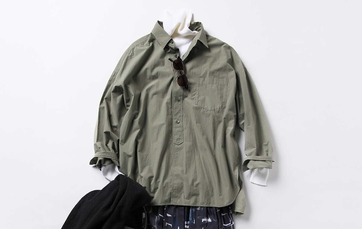 コンサバに転びがちなシャツ×ロングスカートの着こなし。シャツはシャリっとした素材とオーバーサイズシルエットが今どきのプルオーバーデザイン、スカートは通勤シーンにもなじむモノトーン柄なら、きちんと見えるのに印象的。大人の余裕が香るきれいめスタイルが完成する。小物は黒で統一して全体を辛口に引き締めて。