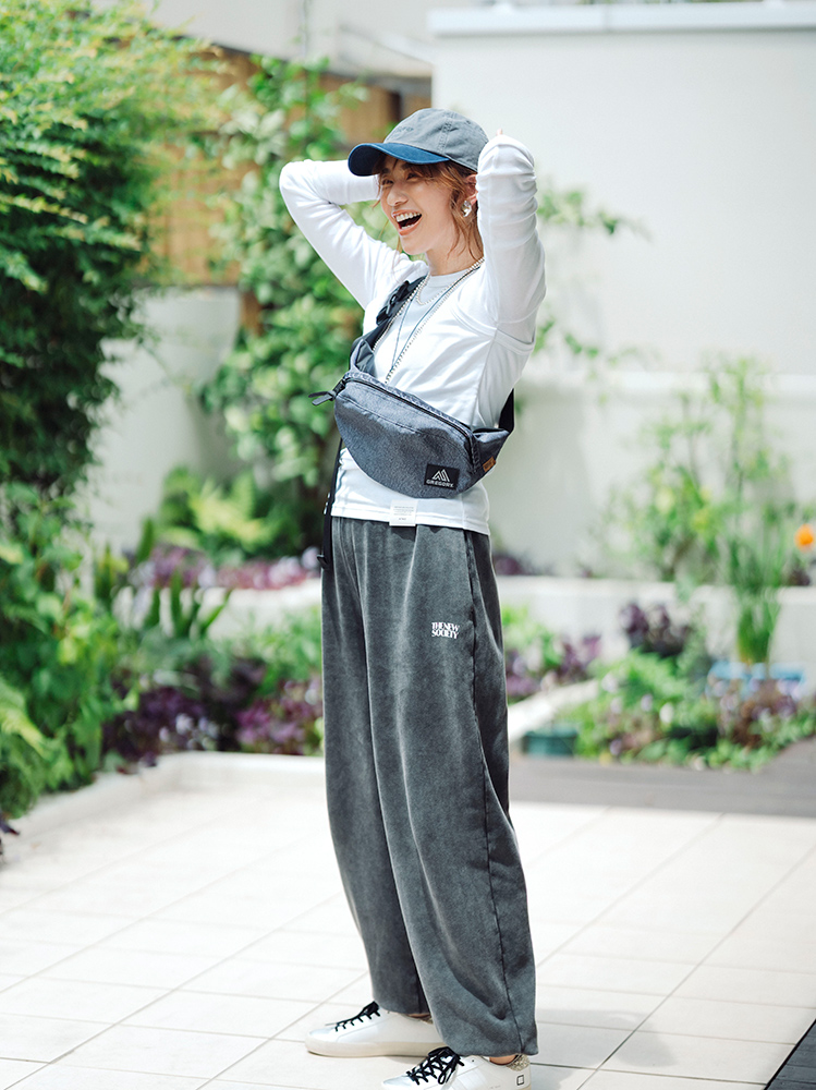 王道のロンT×黒パンツスタイルをストレッチがきいたスポーツウェアにすることで、こなれ感と抜群の軽快さを両立。クロップ丈のトップスにワイドなシルエットのパンツがサマ見えに一役買って。