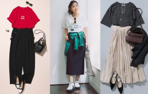 何本でも持っていたい黒パンツ。こちらは落ち素材がワイドシルエットをすっきりと見せているデザイン。白のプリントTにトレンドの赤カーデを羽織ったキレのいいカジュアルコーデで、アクティブな印象に仕上げて。ニット帽や大人かわいい巾着バッグで遊びを効かせると、一層洒落感たっぷりに。