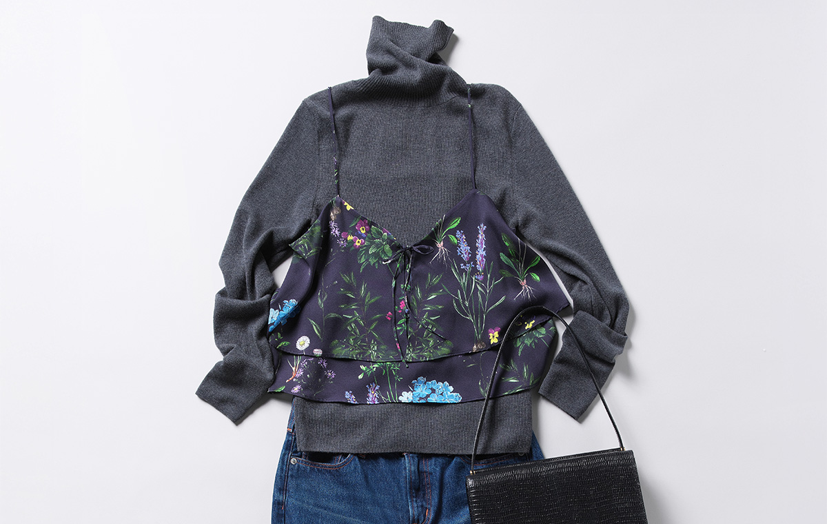 誰でも真似しやすい、無難を回避できるレイヤードテクニック。薄手のチャコールグレーニット×デニムのシンプルコーデに、華やかなボタニカル柄のキャミソールを重ねて気張らないおしゃれを叶えて。休日ランチへは、オケージョンにも活躍しそうなすっきりとしたスクエアバッグ、ツヤっぽい黒パンプスで上品なアクセントを足して、レディな装いにまとめたい。