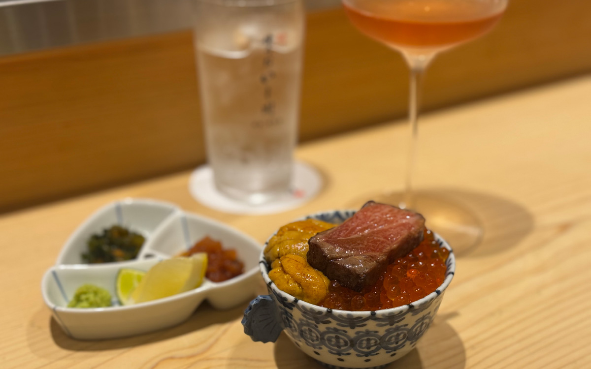 赤酢を使った酢飯の上には、たっぷりのウニとイクラ。さらにその上に、目の前で炙られた肉厚の天然本鮪の大トロがのった豪華な三色丼からコースがスタートします。