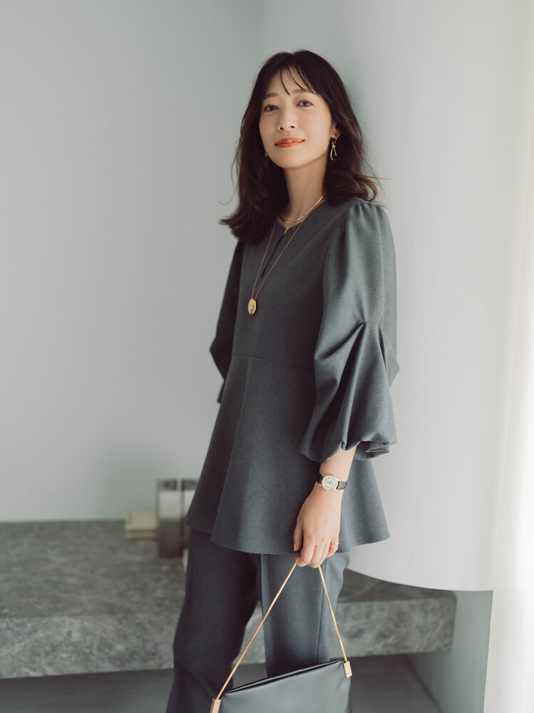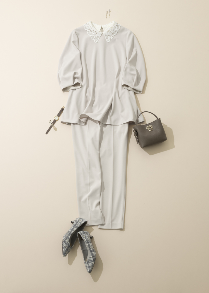 ボリュームスリーブやペプラム裾、レースの襟など顔まわりを盛り上げるフェミニンなディテールが3割増の”映え”を約束。細身パンツがバランスよく、お参りや会食でも1日を通して快適な着心地を叶えてくれます。
