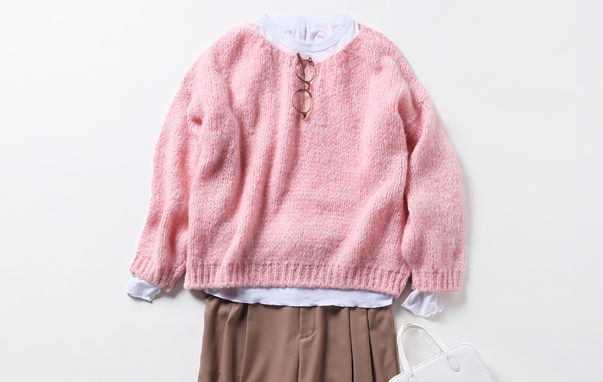 短丈シルエットにふわふわのモヘア素材、やさしげなピンク色。甘い要素たっぷりのニットは、通勤にも活躍するワイドパンツ合わせでハンサムに仕上げるのが大人流。インには白ロンTを入れて肌あたりよく、抜け感もプラス。さらに、アニマル柄のパンプスやメガネで辛口に引き締めると、洒落たバランスにまとまる。