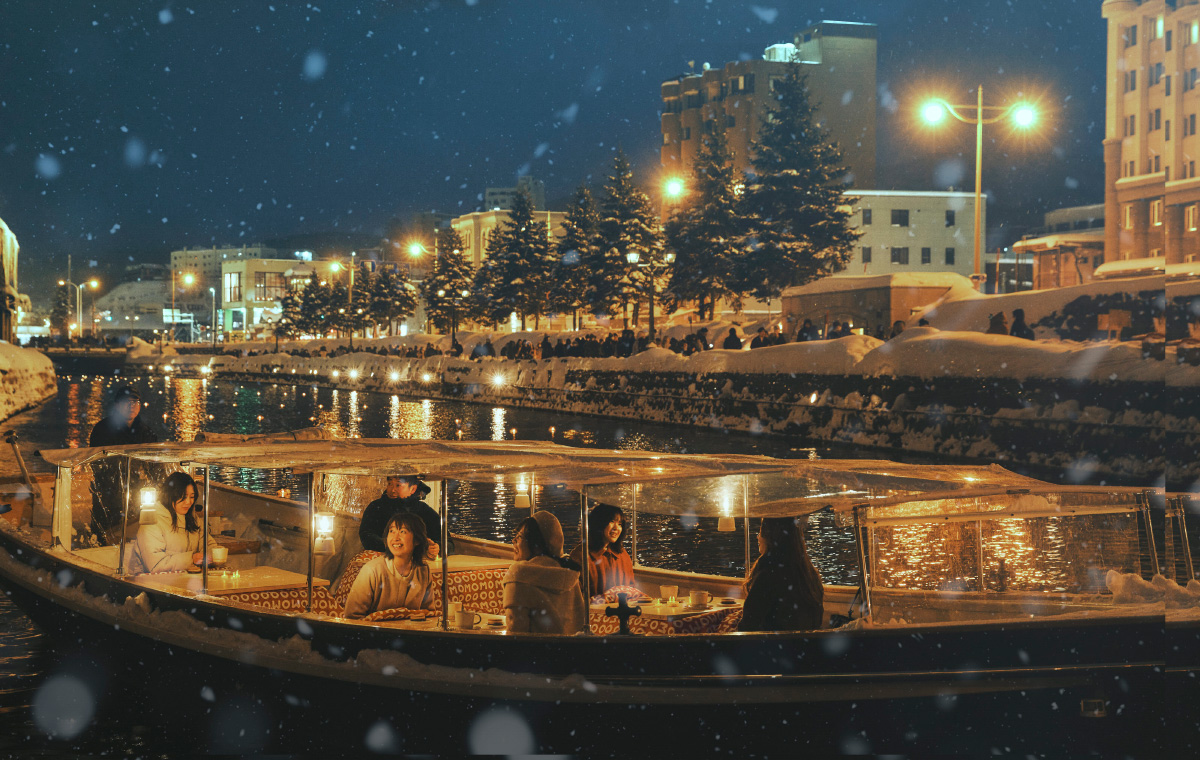 小樽観光の中でも人気で代表的なのが、小樽運河クルージング。運航している船は通常ベンチ席ですが、OMO5小樽のクルージングでは宿泊者限定でテーブルとクッションが設えられた船を貸切で運航しています。
