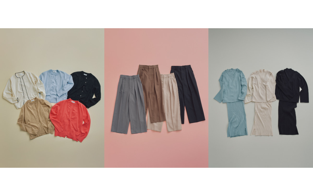 今回は、アンサンブルセット、ワイドパンツ、ニットセットワンピースの計3アイテムが登場。どれも、着こなしの手軽さはもちろん、豊富なカラー展開、シーズンレスに活躍する生地感、手頃なプライスなど、試着なしでも心配無用なアイテムとなっています。