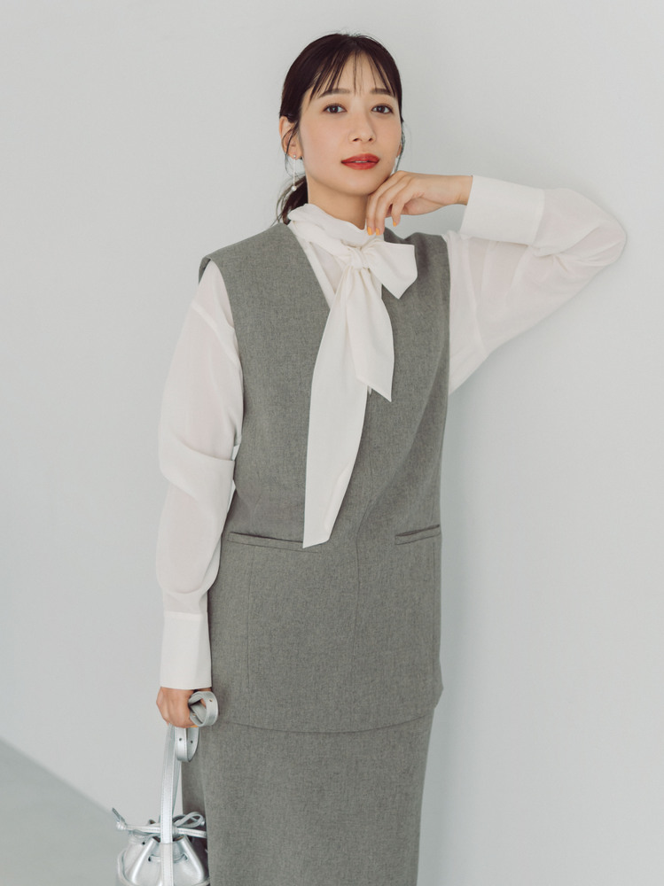 深めのVネックがシャープなジレに、スレンダーなロングタイトを合わせたIラインコーデ。スカートはウエストの後ろがゴム仕様で見た目以上にラクな履き心地が魅力。温もりのあるウールライクな素材とボウタイブラウスのシアー素材のミックス感が洒落感たっぷり。