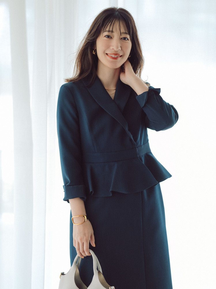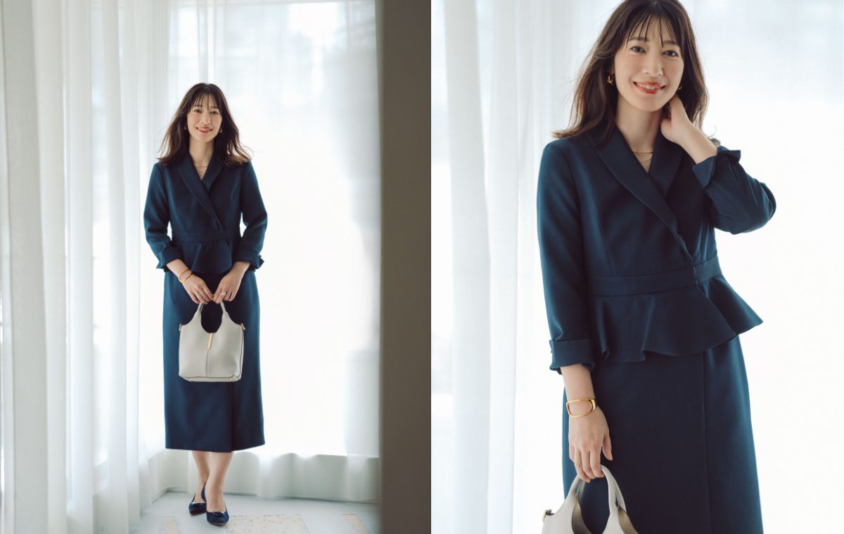 上に羽織らず1枚で着る前提なら1枚で映える、かっちりとフェミニンなデザインのあるものを。ジャケットを羽織る想定なら上半身は程よくフィット感のあるすっきりとしたデザインで、ボトムはやや広がるフレアラインがバランスよく仕上がり、おすすめです。