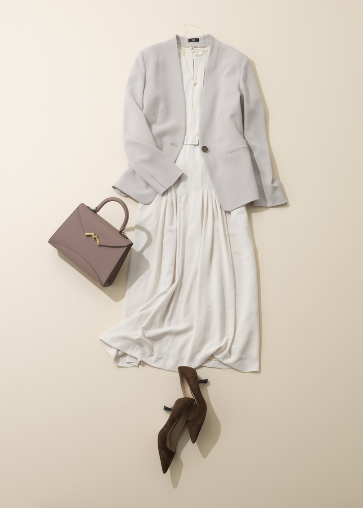 【LOOK2】落ち感のあるプリーツワンピが、ジャケットコーデをエレガントに見せて