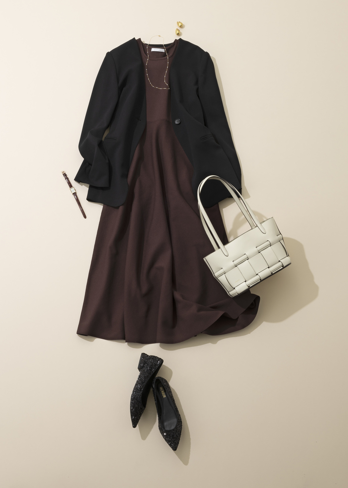 【LOOK3】ブラウンのフレアワンピを、黒ジャケットで凛々しくきちんと