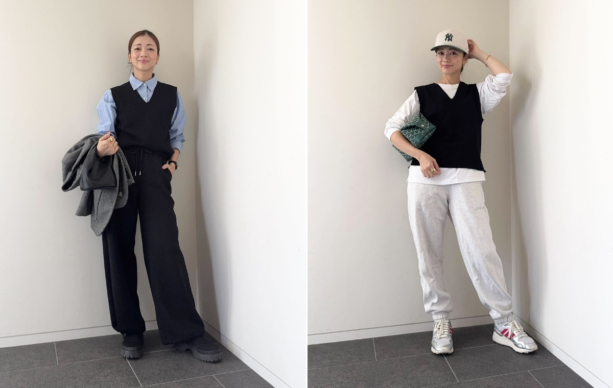 こちらは休日のスポーティなコーディネート。スエットの楽ちんコーデも、ベストを合わせると少し締まりが出て洒落感もアップ! 今回はアクセントにグリーンを足しました。
