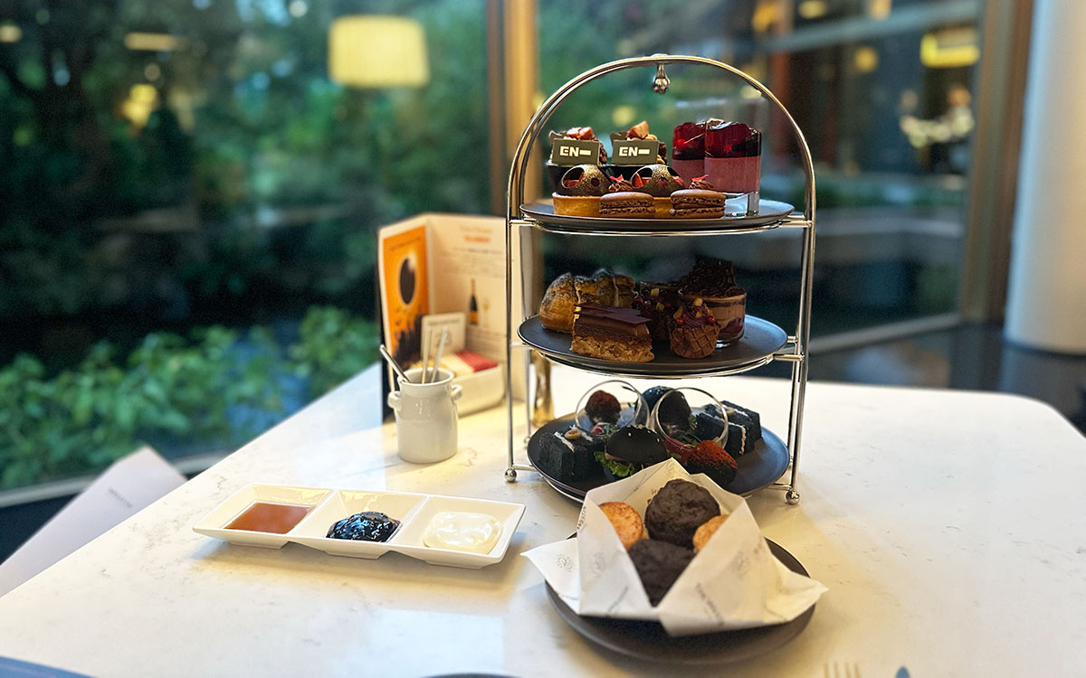 漆黒と深紅を基調としたアーティスティックなティーセットには、シックなエレガンスと幻想的なムードが漂い、目にも鮮やか。スイーツとセイボリーは、シェフが一つひとつ丁寧に仕上げた繊細なものが並びます。