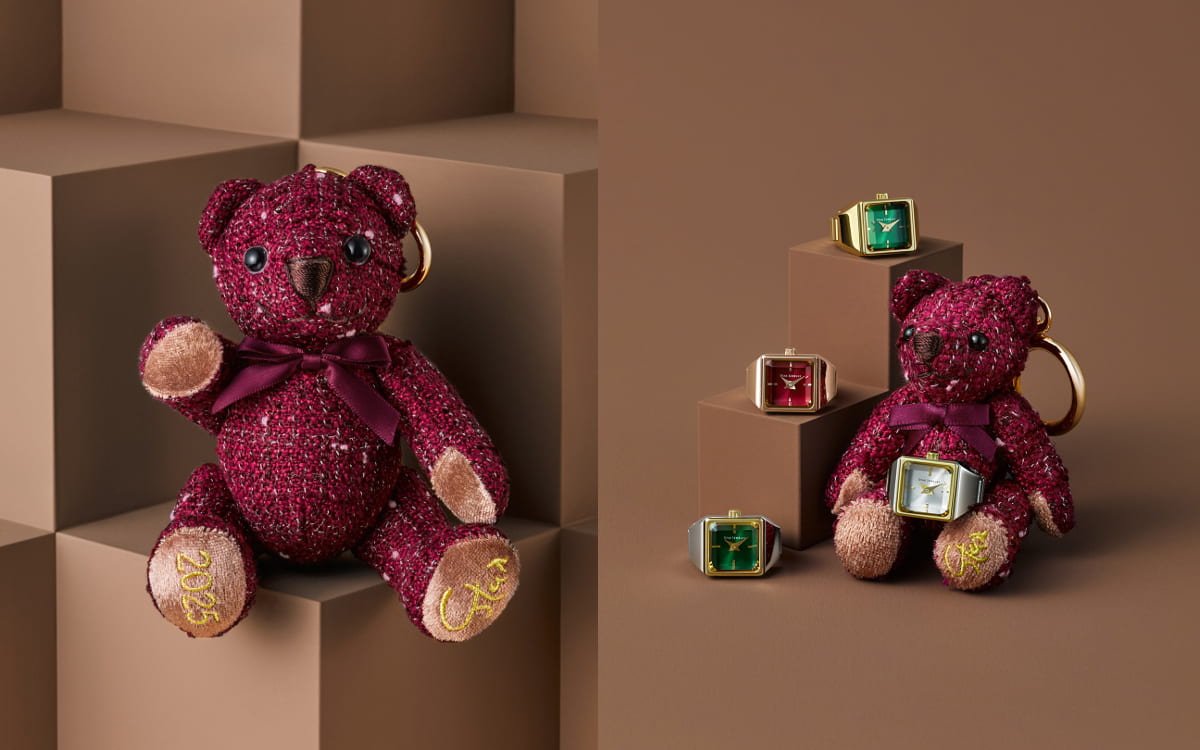昨年早期に完売となったリングウォッチが新デザインで再登場。スタイリッシュなスクエアフェイスに光沢感のある文字盤が、ホリディシーズンのわくわく感を引き立てるデザインです。今年はバッグチャームやキーホルダーとして使えるミニホリディベアがセットに。売上の10%がユニセフへ寄付され、世界の子どもたちの幸福へ繋げます。
