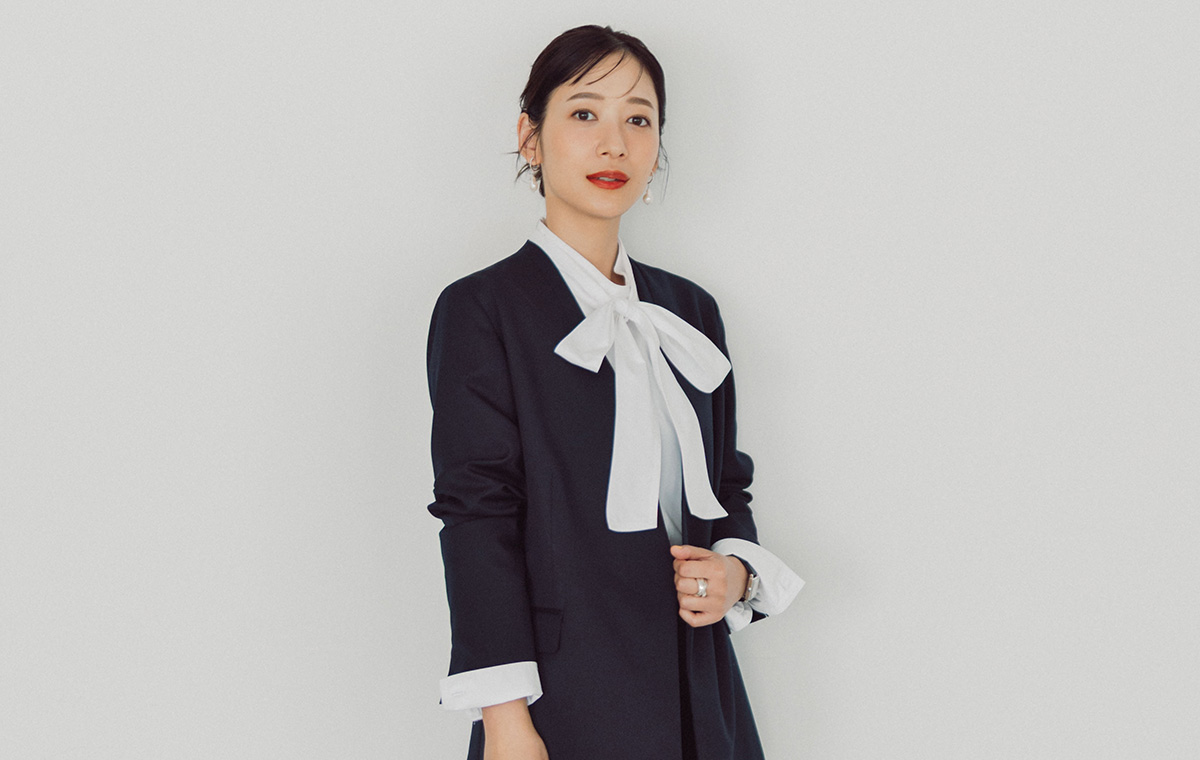 ジャケット¥40,700・スカート¥24,200(デミルクス ビームス 新宿〈デミルクス ビームス〉) ブラウス¥18,920(オンワード樫山〈#Newans〉) バッグ¥594,000(ヴァレクストラ ジャパン〈ヴァレクストラ〉) 靴¥13,200(アルテミス by ダイアナ アーバンドック ららぽーと豊洲店〈アルテミス by ダイアナ〉) 時計¥26,400(ピークス〈ロゼモン〉) イヤリング¥23,100(ヴァンドームブティック 日本橋三越本店〈ヴァンドームブティック〉) リング[3連]¥26,400(ZUTTOHOLIC〈バルブス〉)