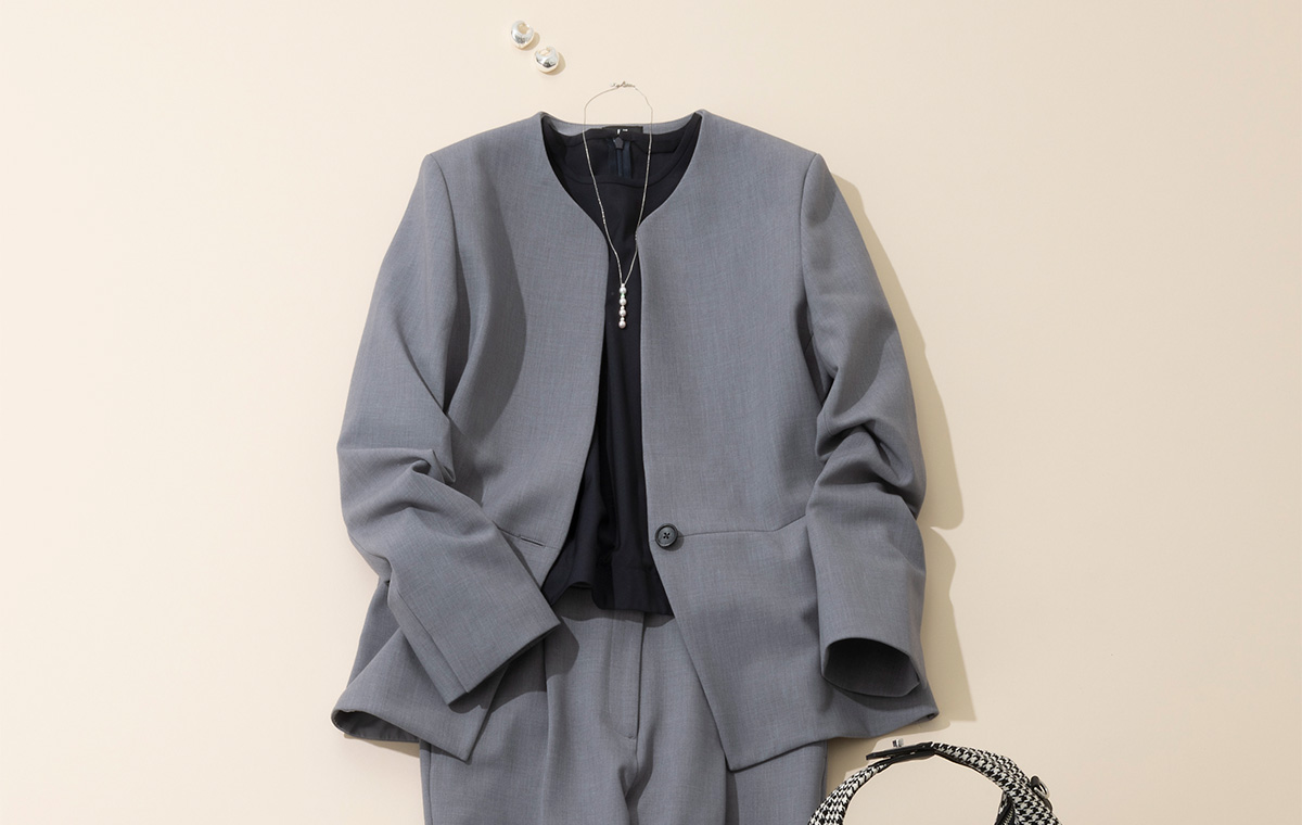 オフィスでも好印象に映える明るいグレーのセットアップは、吸湿発熱のウォームリザーブ素材。ジャケットは顔まわりをすっきりと見せるノーカラー、ウエストで切り替えた後ろのペプラム裾がさりげなく華やかさも加味してくれる。引き締めカラーの黒ブラウスで、ハンサムなセットアップをよりクールに引き立てて。