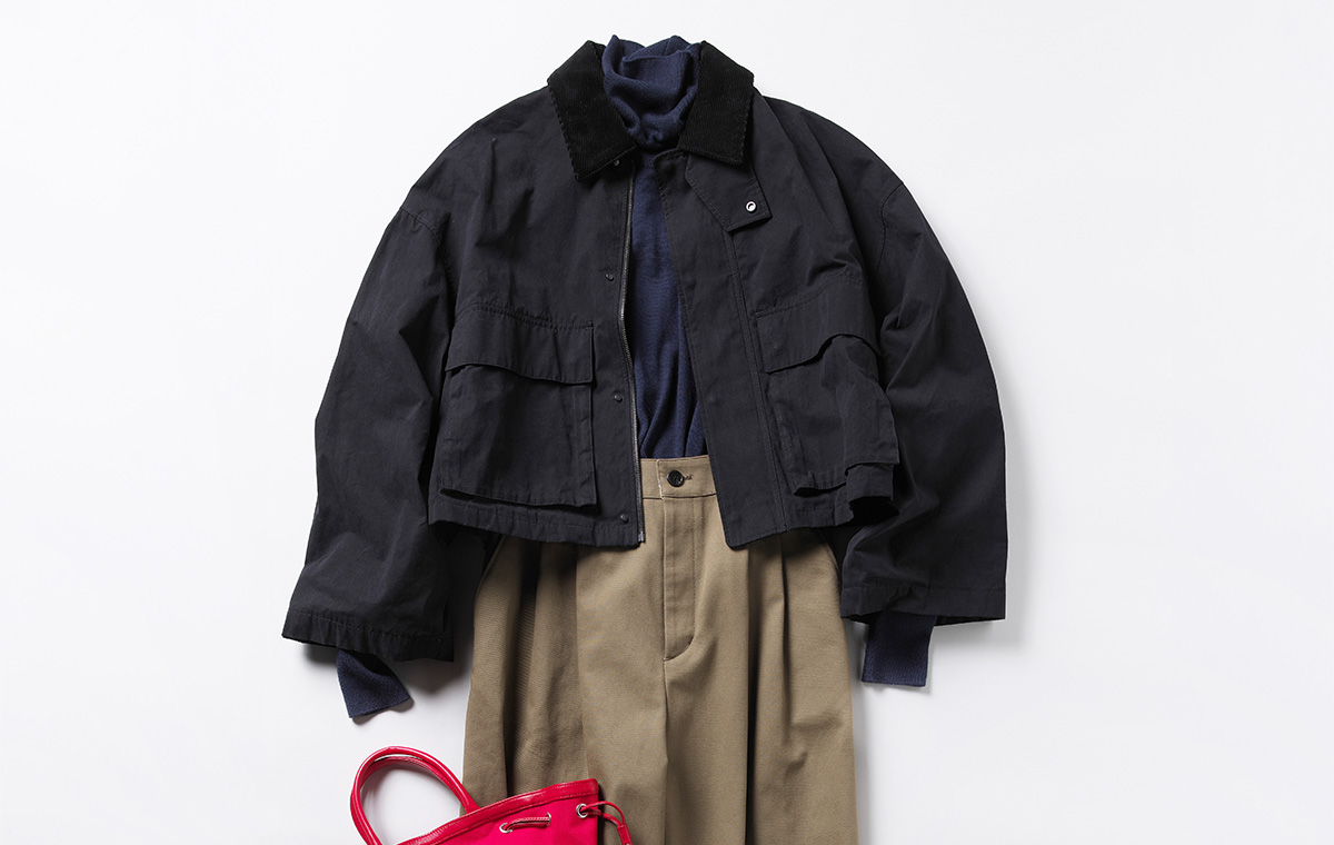 ブラウン寄りのカーキのワイドチノパンに黒ブルゾンを羽織った、最旬のトラッドコーデ。メンズライクなブルゾンは短丈シルエットと極太の袖がモードな雰囲気で、無骨ななかにも女性らしさが漂う。黒×カーキのドライな配色を、ネイビーニットを挟むことできれいめに引き寄せて、かっこいいだけじゃない上品さもまとった大人ハンサムに着地させて。