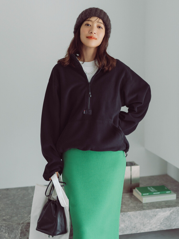 1枚あると多様なアレンジが可能な黒フリースこそ、優秀デザインのものをチョイス。裾のドローコードで印象を変えられる、絶妙なゆったりシルエット。胸元のファスナーからのぞく白Tとシルバーネックレスが爽やかで、グリーンのニットタイトが全体をキレよくまとめて。クラシックなスニーカーで大人めカジュアルに。
