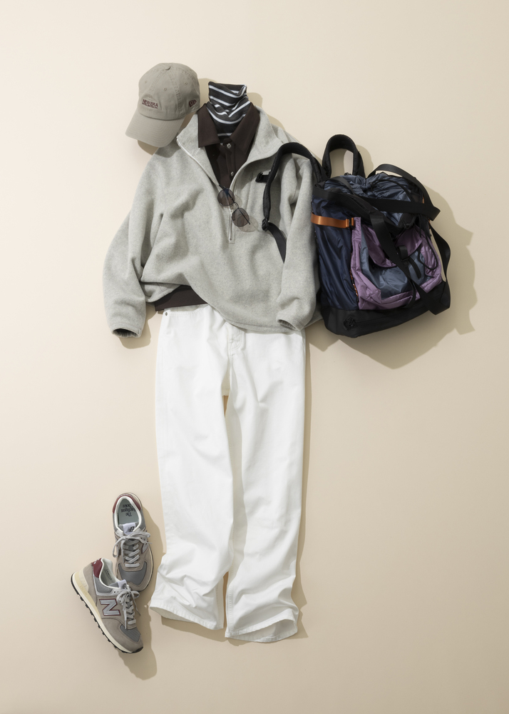 しっとりと柔らかい素材にライトグレーが品よく映える大人向けのフリース。ファスナーを大きく開け、ボーダーのタートルニットとブラウンのポロニットをレイヤードした新鮮な着こなしに。ボトムは白デニムパンツで軽やかにバランスをとって。