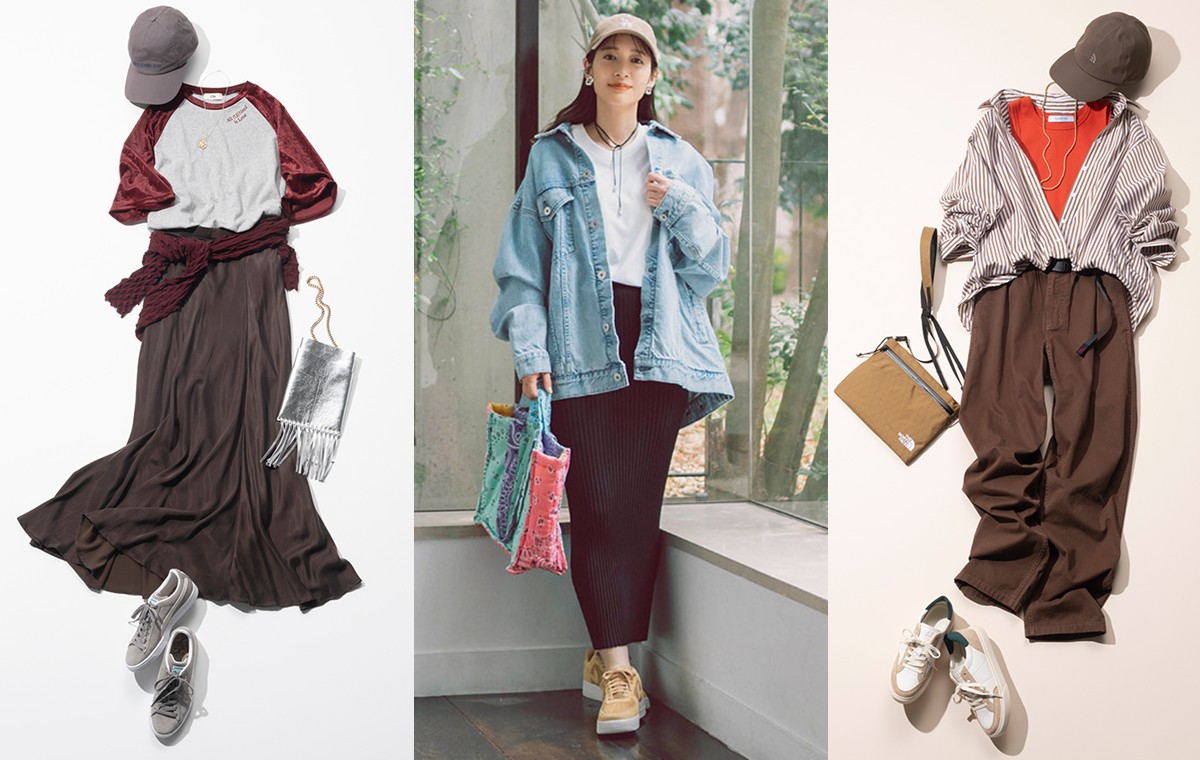 遊園地などのアミューズメントパークに遊びに行く際は、動きやすさと洒落感が両立したキレのいいカジュアルコーデがベスト。それを秋のトレンドカラーであるブラウンで取り入れると半歩先の洒落感が漂い、一段とフレッシュな印象に。
