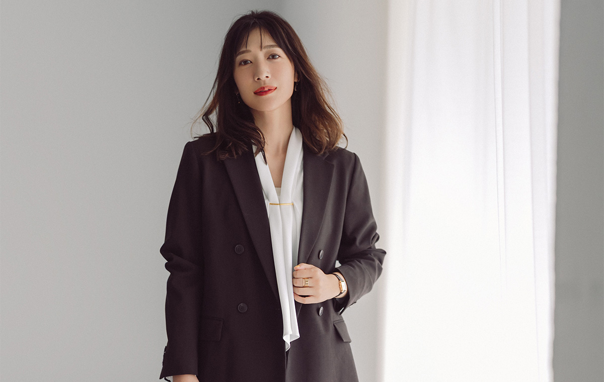 ジャケット¥6,990・パンツ¥3,990(UNIQLO) ブラウス¥8,990(PLST) 中に着たキャミソール¥9,900(FRAY I.D ルミネ新宿2店〈FRAY I.D〉) バッグ¥99,000(J&M デヴィッドソン カスタマーセンター〈J&M デヴィッドソン〉) 靴¥26,400(銀座かねまつ6丁目本店〈銀座かねまつ〉) 時計¥28,600(ピークス〈ロゼモン〉) ピアス¥154,000(マリハ) リング¥4,620(ZUTTOHOLIC〈フル オブ グレイス〉)