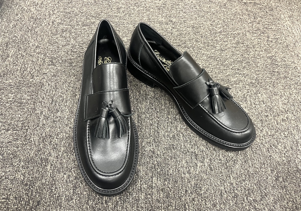 シュリンクの型押しレザーが高級感を漂わせる、タッセルローファー。ソフトな履き心地に加え、雨の日でも履ける万能選手! 靴[2.5]¥26,400(銀座かねまつ6丁目本店〈銀座かねまつ〉)