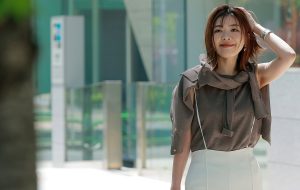 くすみブルーのシアーシャツが、クリーンな白ワンツーコーデにこなれ感をプラス。リネン素材のベージュローファーで足元に程よく抜け感をもたらして。