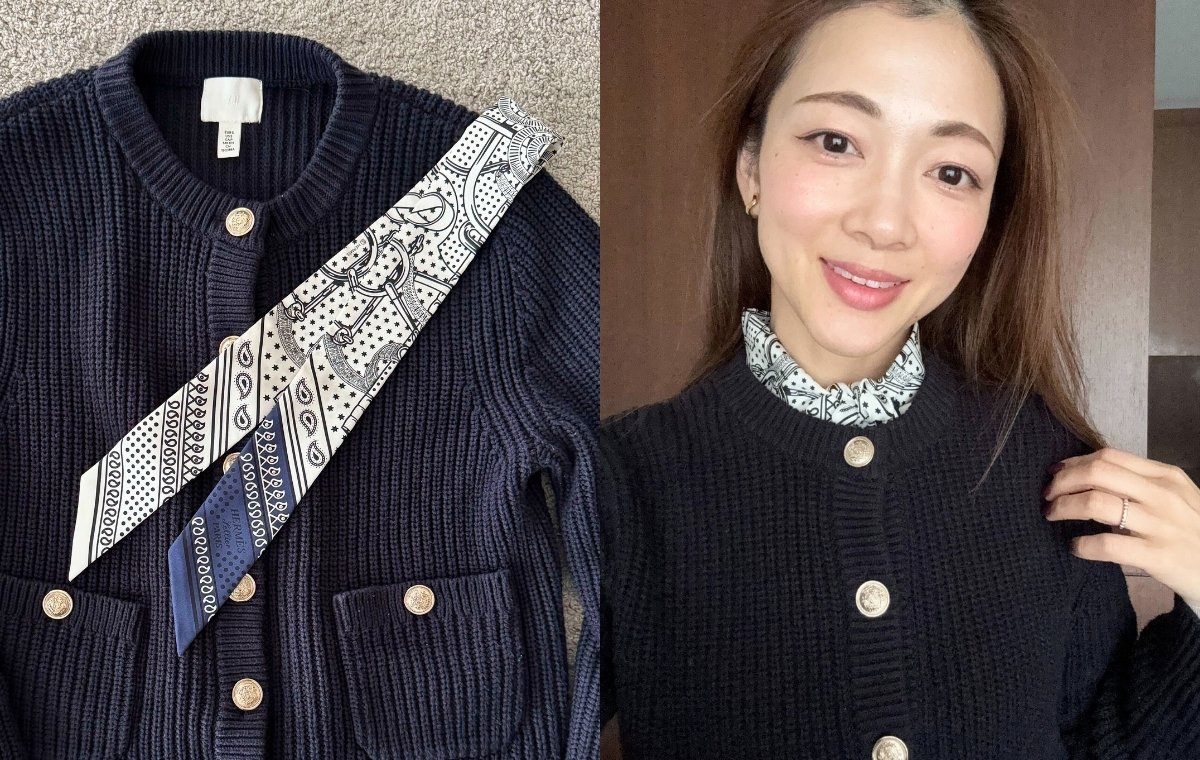 こうすればニットと一体感も出て、首周りが華やかに。首元も暖かくなりますし、アウターを羽織ってもチラッと見える柄がおしゃれで抜け感が出ます!