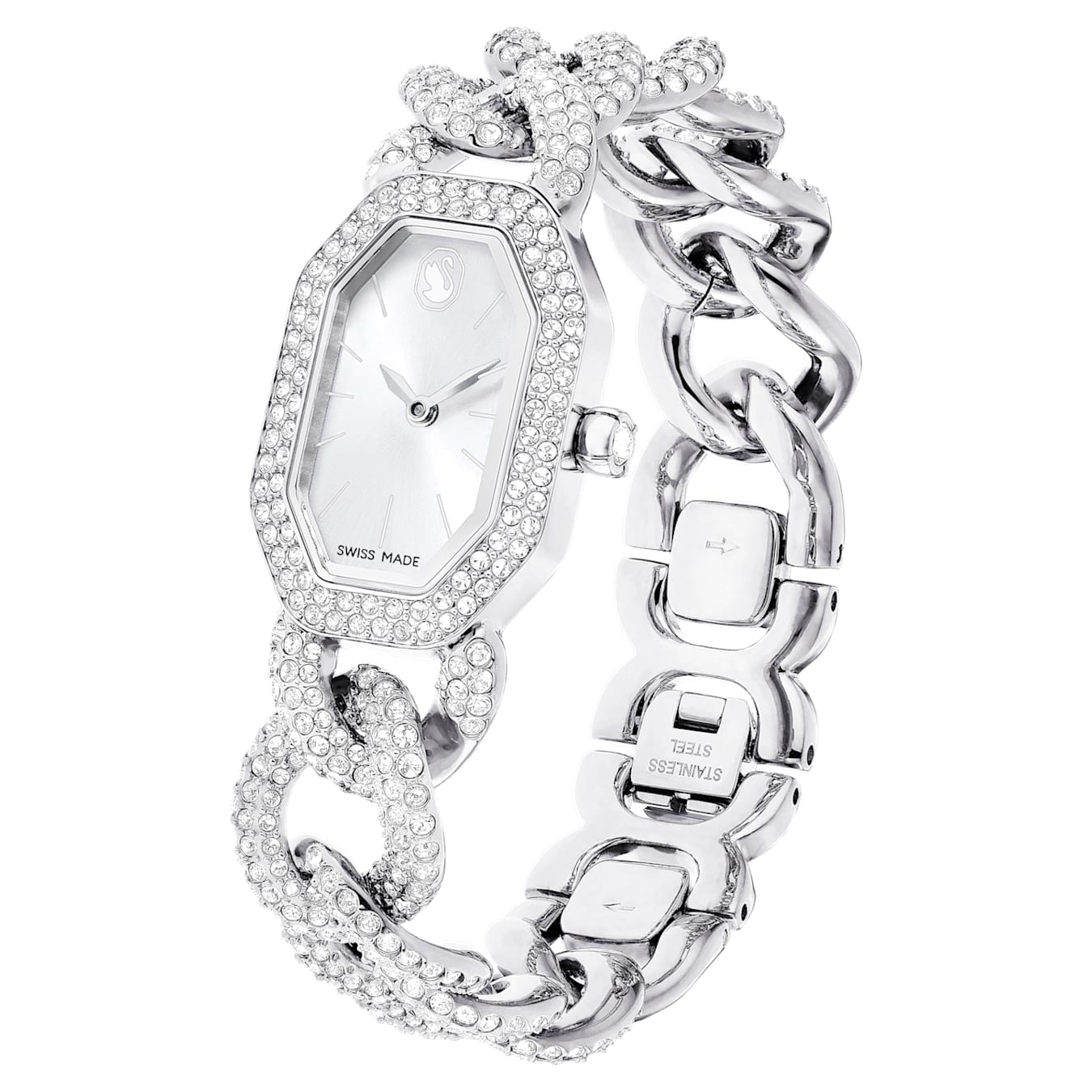 スワロフスキーのアイコニックなオクタゴンシェイプが、光を捉えて輝くバングルウォッチ。肌馴染みの良いローズゴールドトーン仕上げのデザインに、286個のクリスタルをセッティング。女性らしさ溢れるまばゆい時計は、唯一無二の存在感を放ちます。