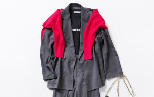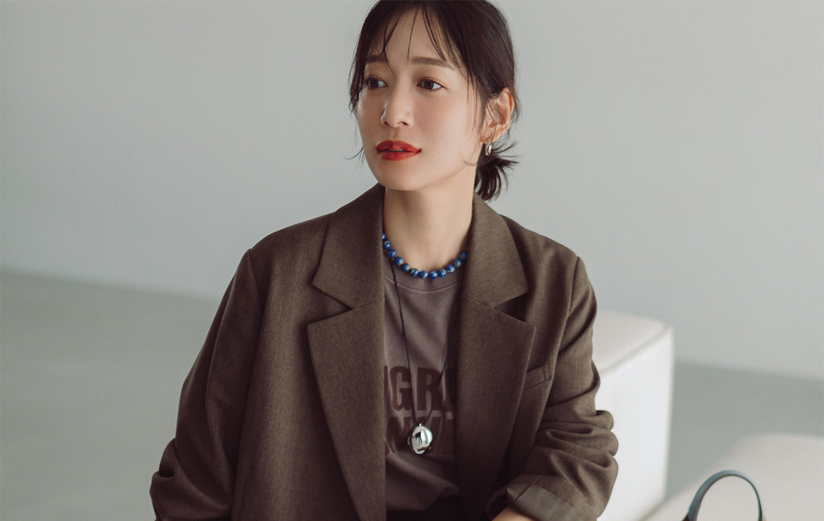 ジャケット¥19,800(ジャーナル スタンダード レリューム ルミネ新宿店〈ジャーナル スタンダード レリューム〉) 中に着たTシャツ¥9,900(アルページュストーリー) パンツ¥19,800(MIESROHE ルミネ新宿1店〈MIESROHE〉) バッグ¥185,900(トッズ・ジャパン〈トッズ〉) 靴¥19,800(オニツカタイガージャパン〈Onitsuka Tiger〉) ソックス¥3,630(デミルクス ビームス 新宿〈パンセレラ〉) 時計¥36,300(エイチエムエスウォッチストア 表参道〈リップ〉) ピアス¥2,750(AKTE) ネックレス[短]¥24,200(フラッパーズ〈オクチ ジュエリー〉) ネックレス[長]¥28,600(プラス ヴァンドーム) バングル¥33,000(フーブス〈quip queint〉)