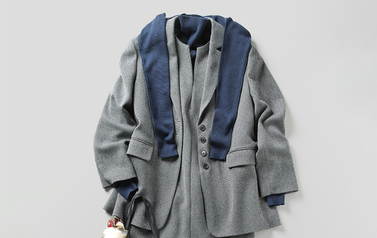 ジャケット¥16,990・ワンピース¥13,990(オンワード樫山〈アンフィーロ〉) ニット¥52,800・カーディガン¥58,300 (リーミルズ エージェンシー〈ジョン スメドレー〉) バッグ¥40,700(ヴァジックジャパン〈ヴァジック〉) 靴¥110,000(ネブローニ) スカーフ¥16,500(マニプリ)