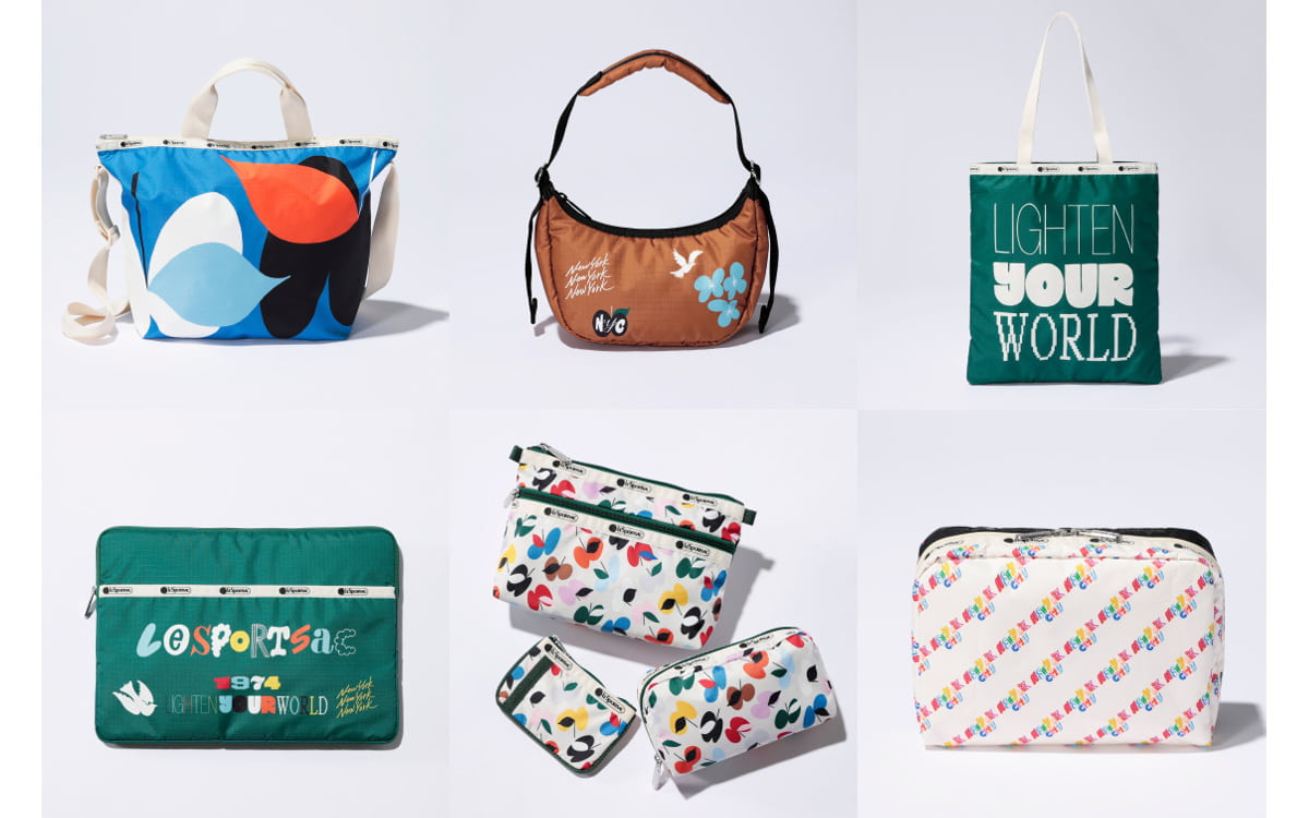 表面には大胆に「りんご」を、背面にはレスポートサックのブランドコンセプト「LIGHTEN YOUR WORLD」の文字をSHOGO SEKINE氏の手描きタイポグラフィーで表現したバッグとポーチ。