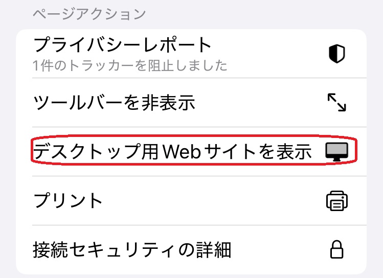 ページメニューの画面に移るので、下のほうにある「デスクトップ用Webサイトを表示」をタップすれば完了です。