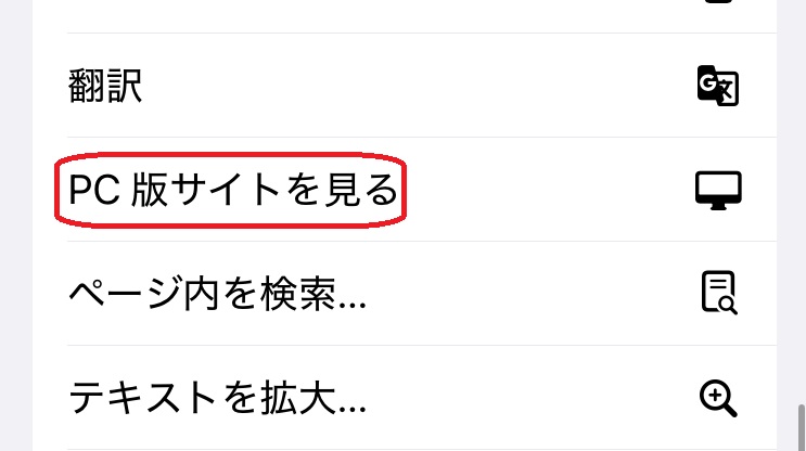 メニューが下から半分出てくるので、上にスワイプしてすべて表示させます。中段にある「PC版サイトを見る」をタップすれば、デスクトップウェブサイトを表示できます。